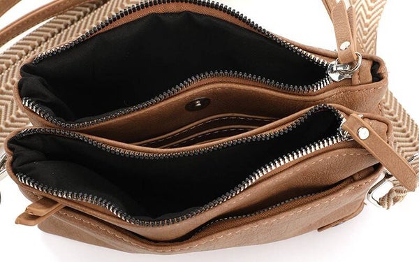 De voorzijde van de tas heeft een royaal vak voor je telefoon, en is prachtig afgewerkt met een natuurlijke croco print. Binnenin vind je twee grote vakken, ieder afgesloten met een rits, plus een handig middenvak met insteekvakjes voor je pasjes. Dit vak sluit af met een magneetsluiting, ideaal voor je pasjes en papiergeld!